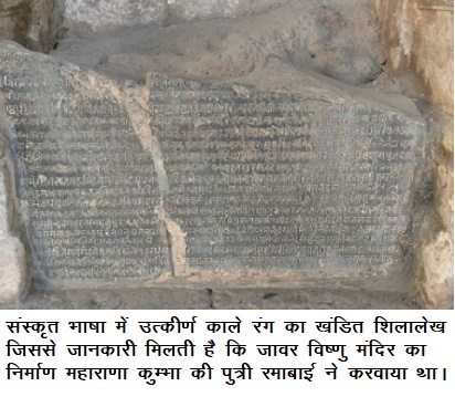 जावर स्थित विष्णु मंदिर में एक काले पत्थर का शिलालेख भी मिला है, जो संरक्षण के आभाव में शीर्णशीर्ण में अवस्था में है। संस्कृत भाषा में उत्कीर्ण इस शिलालेख से यह जानकारी मिलती है कि जावर स्थित रामस्वामी मंदिर (विष्णु मंदिर) एवं जलकुंड (रमाकुंड) का निर्माण महाराणा कुम्भा की पुत्री रमा बाई ने करवाया था, जो आजीवन जावर में ही रहीं।