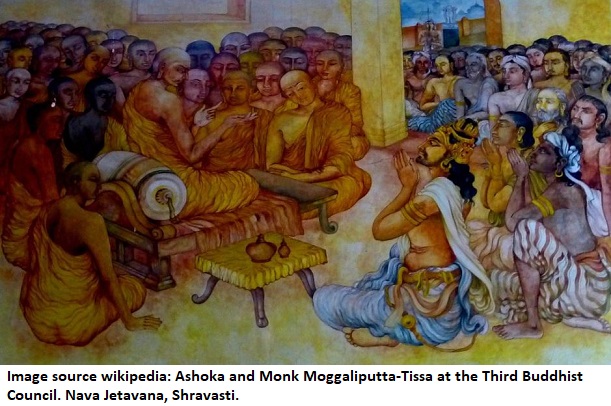 सिंहली अनुश्रुतियों-दीपवंश एवं महावंश के अनुसार, अशोक के राज्यकाल में पाटलिपुत्र में बौद्ध धर्म की तृतीय संगीति का आयोजन किया गया। इसकी अध्यक्षता मोग्गालिपुत्ततिस्स नामक प्रसिद्ध बौद्ध भिक्षु ने की थी। तृतीय बौद्ध संगीति के दौरान ही अभिधम्म पिटक की रचना भी हुई। इस संगीति की समाप्ति के पश्चात भिन्न देशों में बौद्ध धर्म के प्रचारार्थ भिक्षु भेजे गए जिनके नाम महावंश में इस प्रकार प्राप्त होते हैं- कश्मीर तथा गन्धार, यवन देश, हिमालय देश, अपरान्तक, महाराष्ट्र्र, मैसूर, उत्तरी कन्नड़, सुवर्णभूमि, लंका।