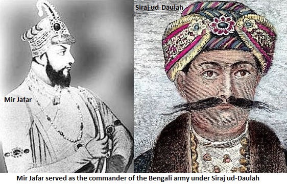 प्लासी का युद्ध (23 जून 1757)- अलीनगर की सन्धि के बाद भी अंग्रेज चुप नहीं बैठे, उन्होंने नवाब के अधिकारियों के बईमानी और घूसखोरी का लाभ उठाकर षड्यंत्र रचना शुरू कर दिया। जिसके तहत अंग्रेजों ने नवाब सिराजुद्दौला के मुख्य सेनापति मीरजाफर तथा प्रभावशाली साहूकार जगत सेठ, राय दुर्लभ तथा अमीचन्द को एक बिचौलिए के रूप में शामिल किया। यह तय किया गया कि मीरजाफर को नवाब बना दिया जाए इसके बदले वह कम्पनी के लिए काम करेगा और उसकी हानि की क्षतिपूर्ति भी करेगा।