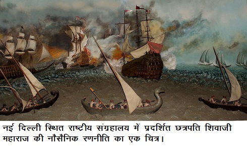 यदि हम शिवाजी महाराज की सैन्य रणनीति की बात करें तो सामुद्रिक शक्तियों- पुर्तगाली, डच, अंग्रेज, फ्रांसीसियों तथा अपने सबसे बड़े दुश्मन मुगल बादशाह औरंगजेब के समय एक शक्तिशाली नौसैनिक बेड़ा रखना उनकी सबसे बड़ी उपलब्धि थी।