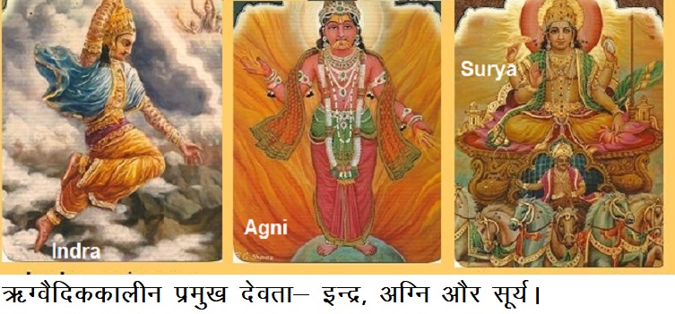 ऋग्वैदिक लोग सार्वभौमिक सत्ता में विश्वास रखते थे। ऋग्वेद अनेक देवताओं का अस्तित्व मानता है हांलाकि देवियों की नगण्यता थी। तकरीबन सभी देवता प्राकृतिक शक्तियों के प्रतीक थे। आर्यों के देवताओं की तीन श्रेणियां थीं— 1— आकाश देवता: सूर्य, वरूण, द्यौस, मित्र, पूषन, विष्णु, सवितृ, आदित्य, उषा, अश्विन आदि। 2— अंतरिक्ष के देवता: इन्द्र, रूद्र, मरूत, वायु, पर्जन्य, मातश्विन आदि। 3— पृथ्वी के देवता : अग्नि, सोम, पृथ्वी, बृहस्पति, सरस्वती आदि।
