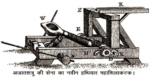 इस शक्तिशाली मोर्चा के खिलाफ अजातशत्रु ने रथमूसल और महाशिलाकंटक जैसे दो गुप्त हथियारों का प्रयोग किया जिससे भारी संख्या में मनुष्य मारे जा सकते थे। इन दोनों हथियारों को महामूवी बाहुबली में दिखाया जा चुका है। 'महाशिला कंटक' नामक हथियार एक बड़े आकर का यन्त्र था, इस यंत्र द्वारा बड़े-बड़े पत्थरों को उछालकर मार जाता था। जबकि 'रथ मुशल' नामक हथियार में चाकू और पैने किनारे पर लगे रहते थे तथा सारथि के लिए सुरक्षित स्थान होता था जहाँ से बैठकर वह रथ को हांककर शत्रुओं का नरसंहार करता था। अजाशत्रु ने अपने इन हथियारों के बल पर भयानक नरसंहार किया था जिससे युद्ध में लिच्छवी बुरी तरह पराजित हुए।