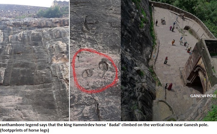 इतने में रतिपाल और सुर्जनशाह ने गणेश पोल को बंद कर दिया ताकि हम्मीरदेव किले में नहीं घुस पाए। यही वो मोड़ है, जहां से महान शासक हम्मीरदेव के घोड़े ‘बादल’ का इतिहास सबके सामने आता है। गणेश पोल का द्वार बंद होते ही हम्मीरदेव ने अपने इष्ट भगवान शिव से प्रार्थना की और अपने प्रिय घोड़े बादल को छलांग लगवा दी, देखते ही देखते बादल गणेश पोल के पास किले की काफी ऊंची दीवार पर चढ़ गया। बता दें कि मुख्य द्वारों में से एक गणेश पोल के पास से किले की दीवार की ऊंचाई बहुत ज्यादा है, फिर भी बादल एक ही बार में किले के अन्दर प्रवेश कर गया। किले के द्वार गणेश पोल के पास चट्टान पर घोड़े ‘बादल’ के खुर के निशान आज भी मौजूद हैं, जो घटना की पुष्टि करते हैं।