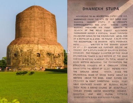 धमेख स्तूप- सारनाथ स्थित धमेख स्तूप में भगवान बुद्ध की अस्थियां रखी हुई हैं। धमेख स्तूप की नींव मौर्य सम्राट अशोक के शासनकाल में पड़ी। इसके बाद सारनाथ की इस सबसे आकर्षक संरचना का विस्तार कुषाण काल में हुआ और यह स्तूप गुप्तकाल में बनकर तैयार हुआ। धमेख स्तूप के निर्माण में ईंट,रोड़ी और पत्थरों का भरपूर इस्तेमाल किया गया है। स्तूप के निचले तल में पत्थरों पर फूलों की शानदार नक्काशी तथा गुप्त लिपि में चिह्न अंकित हैं।