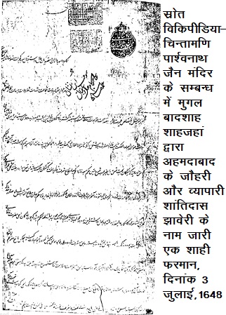 साल 1645 में शाहजहां ने अपने तीसरे बेटे औरंगजेब को गुजरात का गवर्नर नियुक्त किया। शहजादे औरंगजेब ने चिंतामणि पार्श्वनाथ जैन मंदिर को तुड़वाकर मस्जिद में बदलने का आदेश दिया। 10 जनवरी को 1666 को सूरत से अहमदाबाद पहुंचे फ्रांसीसी यात्री एम.डी थेवेनोट के मुताबिक, “चिंतामणि पार्श्वनाथ जैन मंदिर में औरंगजेब ने सबसे पहले एक गाय की हत्या करवाई तत्पश्चात इस मंदिर की दीवारों पर उत्कीर्ण मानव तथा पशु आकृतियों को तुड़वा दिया।” इस बात की पुष्टि एक अन्य फ्रांसीसी यात्री और जौहरी टैवर्नियर ने भी है कि “शहजादे औरगंजेब ने इस मंदिर को मस्जिद में परिवर्तित करवा दिया।”